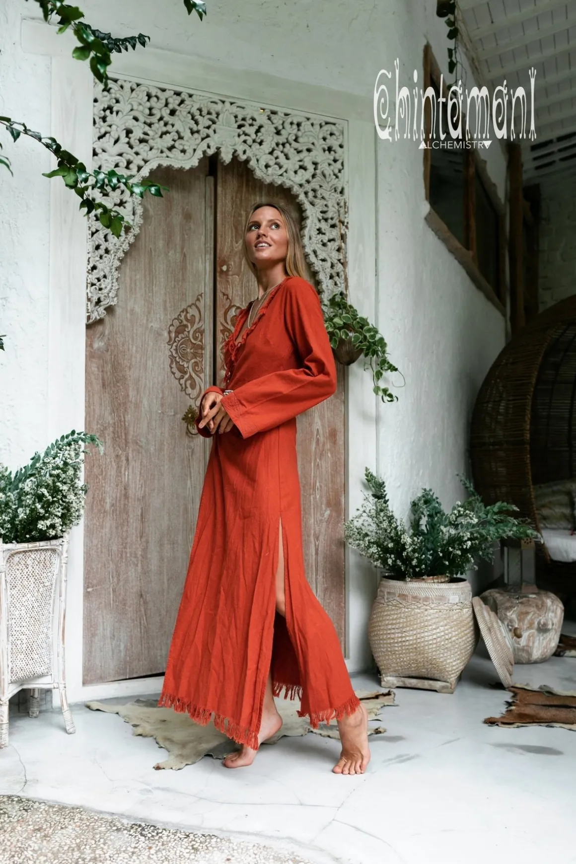 Red Ochre Kimono Maxi Wrap Dress by Chintamani Alchemistry made from handwoven raw cotton is an artefact, that you can wear. Comfortable fit and inspiring look make this long sleeve kimono dress perfect for a tropical holiday, or just that shiny summer day. Handmade fringe and stitched decoration finish off the gracious look with unique detail. Pair it with sandals, our cotton canvas boots or just go barefoot.