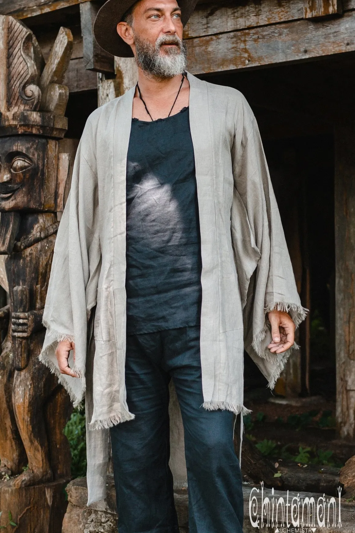 Gorgeous Mens Linen Kimono Cardigan is a gem of our unique Soft Linen collection. The shape of this gown is inspired by classic japanese kimono and transformed by Chintamani Alchemistry into asymmetric tunic for men. It looks both oriental and bohemian and can be worn as a decorative caftan or as a simple and comfortable beach holiday tunic. Wide massive belt, that is going in set with it, shapes this Kimono into sophisticated Japanese yukata. Although, even with the belt, our Linen kimono has a narrow opening in front, so it is supposed to be worn with pants, trousers or beachwear underneath. This piece comes in assorted beautiful colors: dusty pink, silver grey, sage green or classy black.
