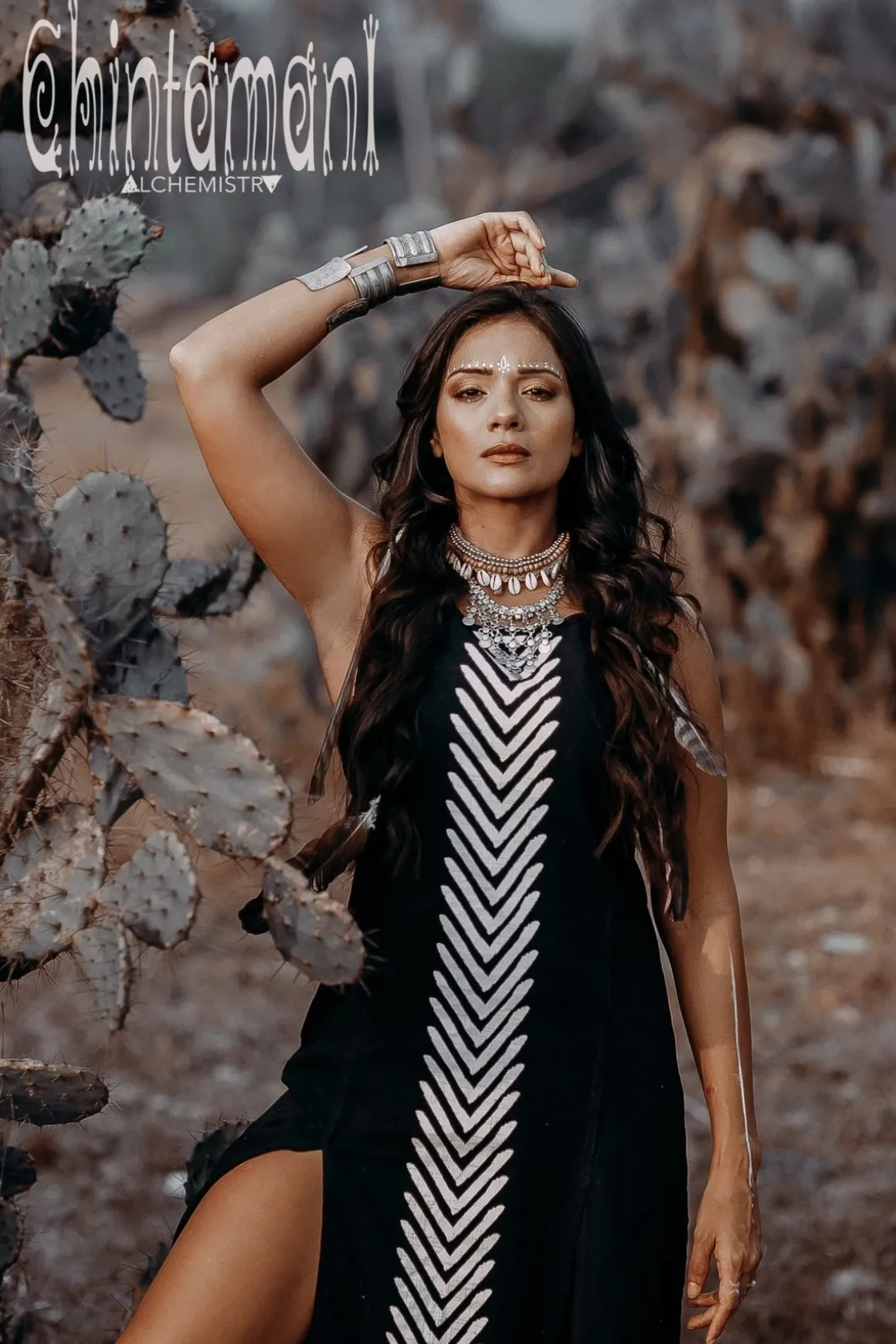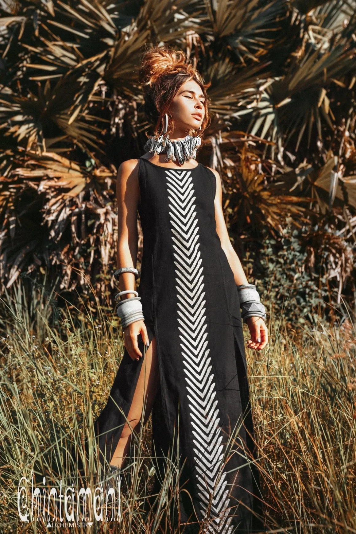 Corners Print Long Maxi Dress is a stunning stand alone artefact from our Organic Cotton Collection. We made the choice of using certified organic fabric as a conscious step towards a cleaner, more fair and beautiful world. The textile we use for this piece is strong and gorgeously textured pure cotton, breathable and durable. It is dyed in classic black color, and also comes in its raw silver grey version. The silhouette of this dress is simple and sleek – but with an amazing detail: there are four slits, two in front and two on the back, that show off your legs when you move or dance in a sensual but elegant manner. Paired with our oriental Kimonos it can become a graceful gown for an artsy occasion, just by itself – it is that perfect light and comfortable dress for an Ecstatic Dance session. The front and back of the piece are decorated with subtle geometric print, to add a little tribal detail. This is a more classy version of a similar Organic Cotton Alchemy Dress, that is available in more vibrant colors (Turquoise, Gray and Coral).