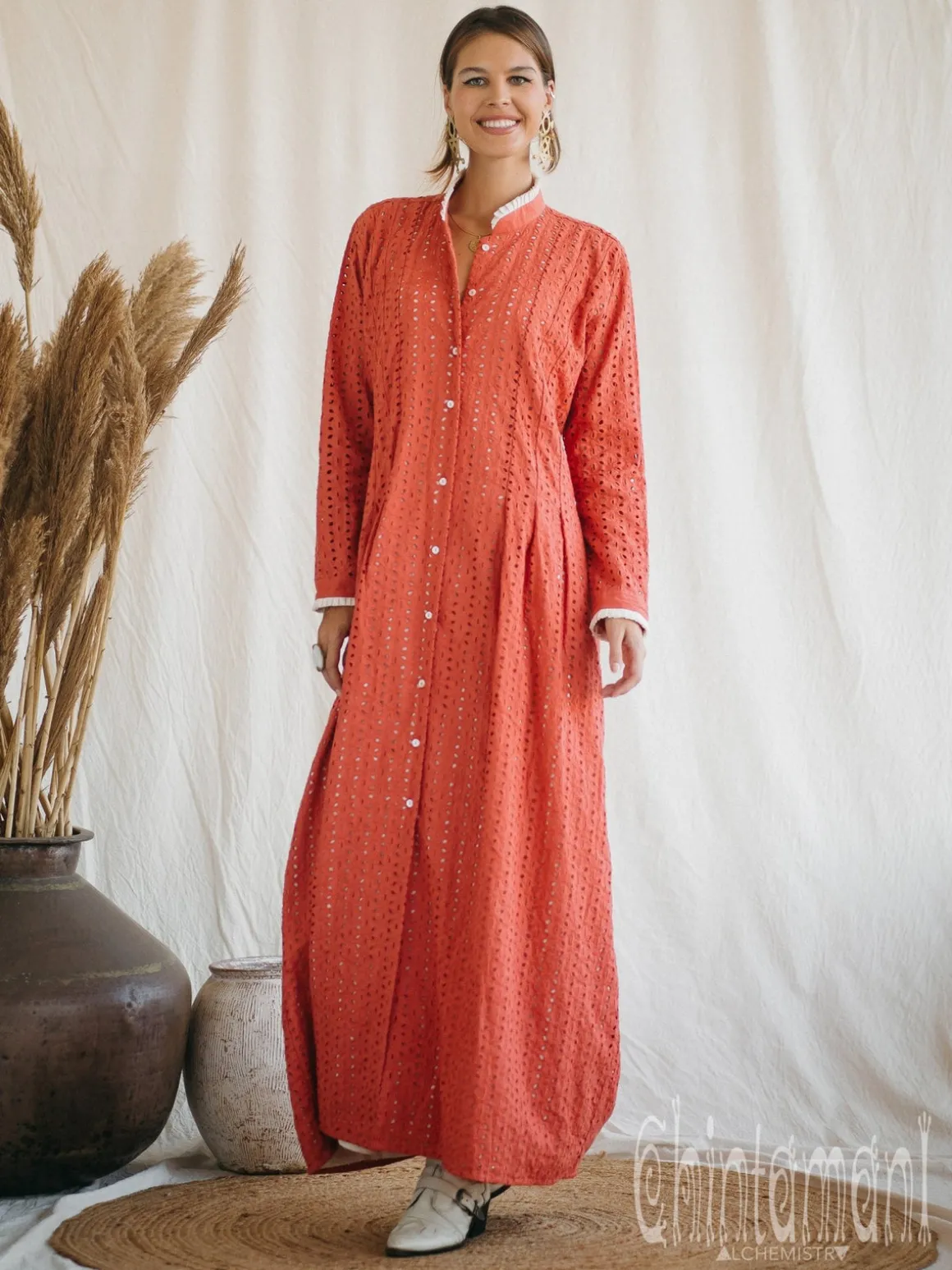 This sophisticated darted maxi dress is a jewel of our broderie anglaise collection! It is traditional European embroidery with eyelets, that was very popular in Victorian Britain. Airy whitework (white embroidery on white) made on certified organic cotton inspired the whole set of romantic and elegant dresses. The fabrics is decorated with six petals flower eyelets, that remind of Chintamani main symbol – the Flower of Life. Meanwhile thin organic cotton white lining makes it non transparent. Classy silhouette with buttons in front is so easy to wear! It doesn’t crinkle and keeps the shape without any effort. Add our canvas vest or soft fluffy shawl – and you are perfectly layered for spring breezy weather. You can get this dress in creamy white, latte beige and rusty red colors.