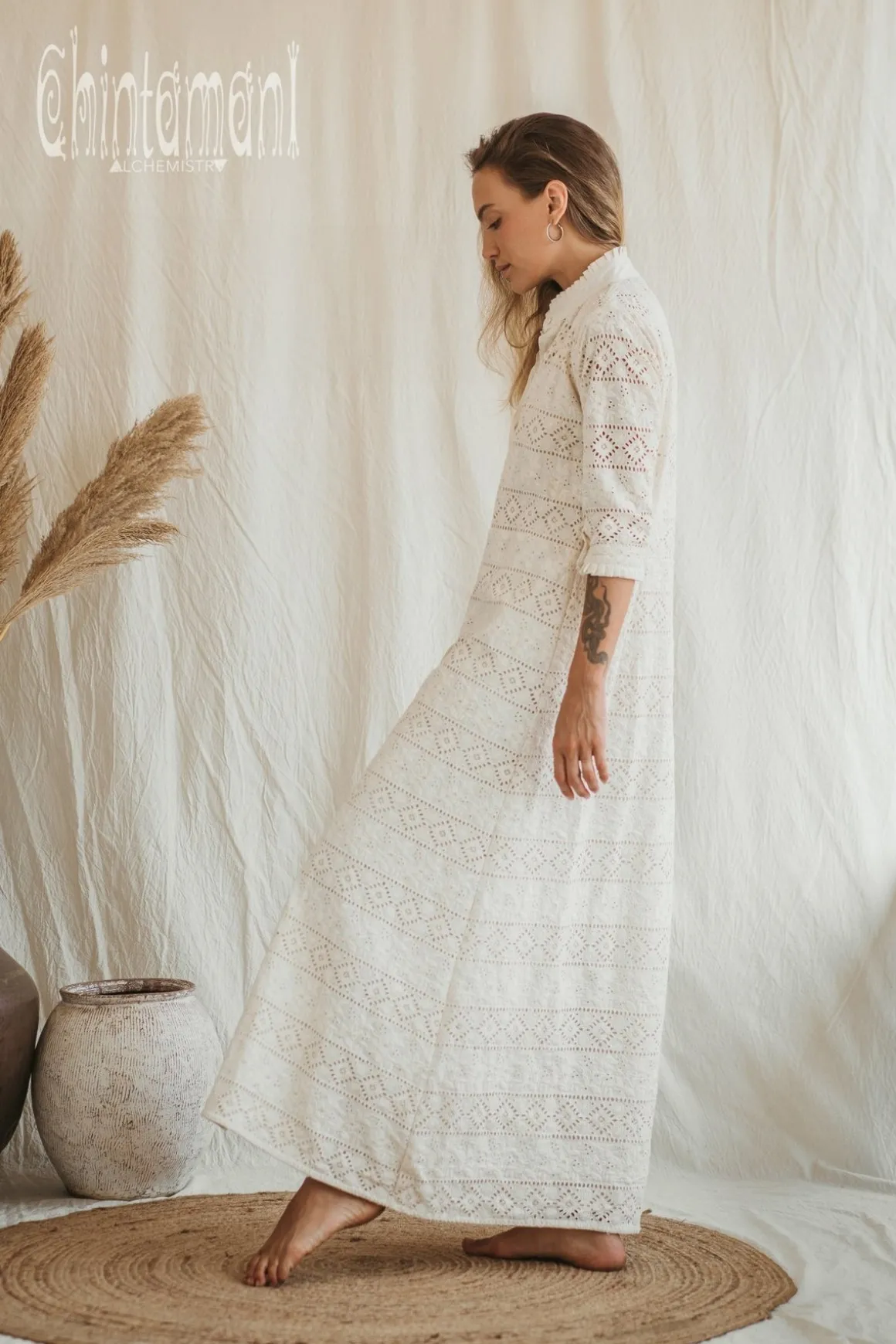 Our new broderie anglaise collection is here! It is traditional European embroidery with eyelets, that was very popular in Victorian Britain. Airy whitework (white embroidery on white) made on certified organic cotton inspired the whole set of romantic and elegant dresses. This shirt dress with creamy white underlayer is one of them. The base is a long simple sleeveless maxi-dress with round neck cut made of the softest cotton. It is semi transparent and can be a perfect base layer for our asymmetric dresses, that are short in front and long in the back – turning them into stunning layered gowns. Second layer is a gorgeous 34 sleeved broderie anglaise shirt dress with gently ruffled cuffs and collar decoration. You can wear second layer separately as cardigan, or put together this simply gorgeous ensemble for ultimately feminine French countryside look. We are picturing morning coffee in Provence with a lavender field view! Dress comes in creamy white, latte beige and rusty red colors.