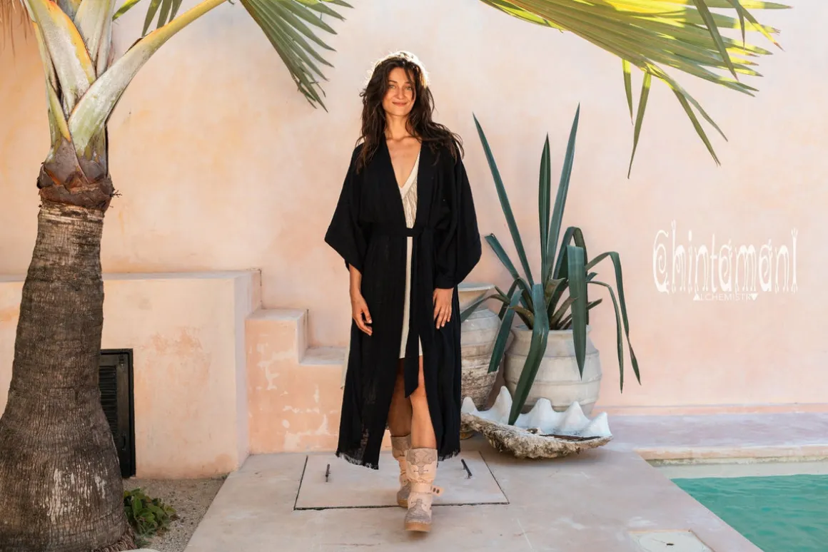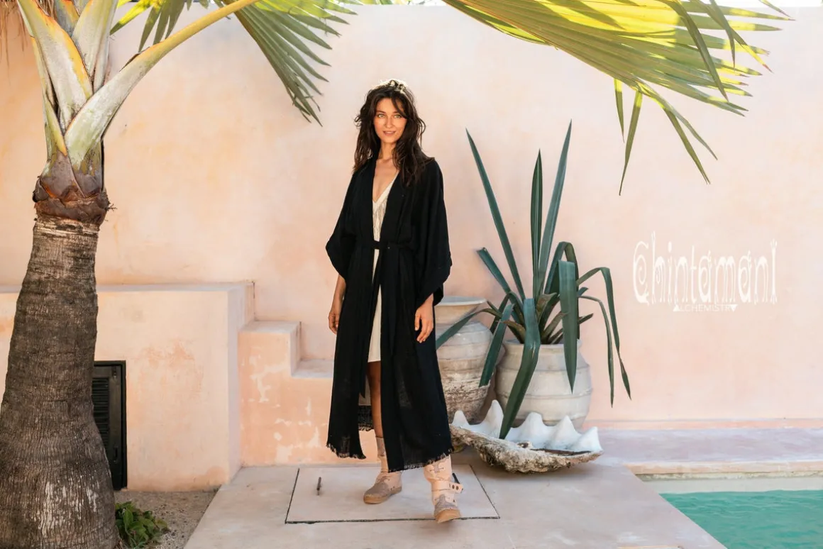 Raw Cotton Printed Kimono is our new simple, elegant, very classy and sleek creation. It is a gorgeous bohemian artefact that you can throw on over any simple dress, jumpsuit or pants with top to have a glamourous evening gown. Nothing too much, just very basic silhouette and primitive geometric print on the back, but the beautiful raw cotton fabric itself and little designer twists here and there make this piece truly unique. Side slits and 34 wide sleeves create very airy feeling to the Kimono. It comes in our signature pale amazing colors – dusty pink, off white, red ochre, sage and black.