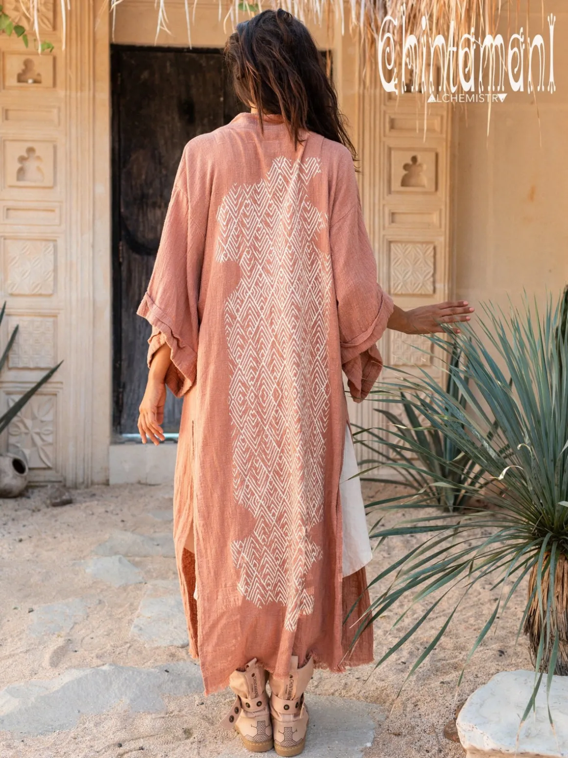 Raw Cotton Printed Kimono is our new simple, elegant, very classy and sleek creation. It is a gorgeous bohemian artefact that you can throw on over any simple dress, jumpsuit or pants with top to have a glamourous evening gown. Nothing too much, just very basic silhouette and primitive geometric print on the back, but the beautiful raw cotton fabric itself and little designer twists here and there make this piece truly unique. Side slits and 34 wide sleeves create very airy feeling to the Kimono. It comes in our signature pale amazing colors – dusty pink, off white, red ochre, sage and black.