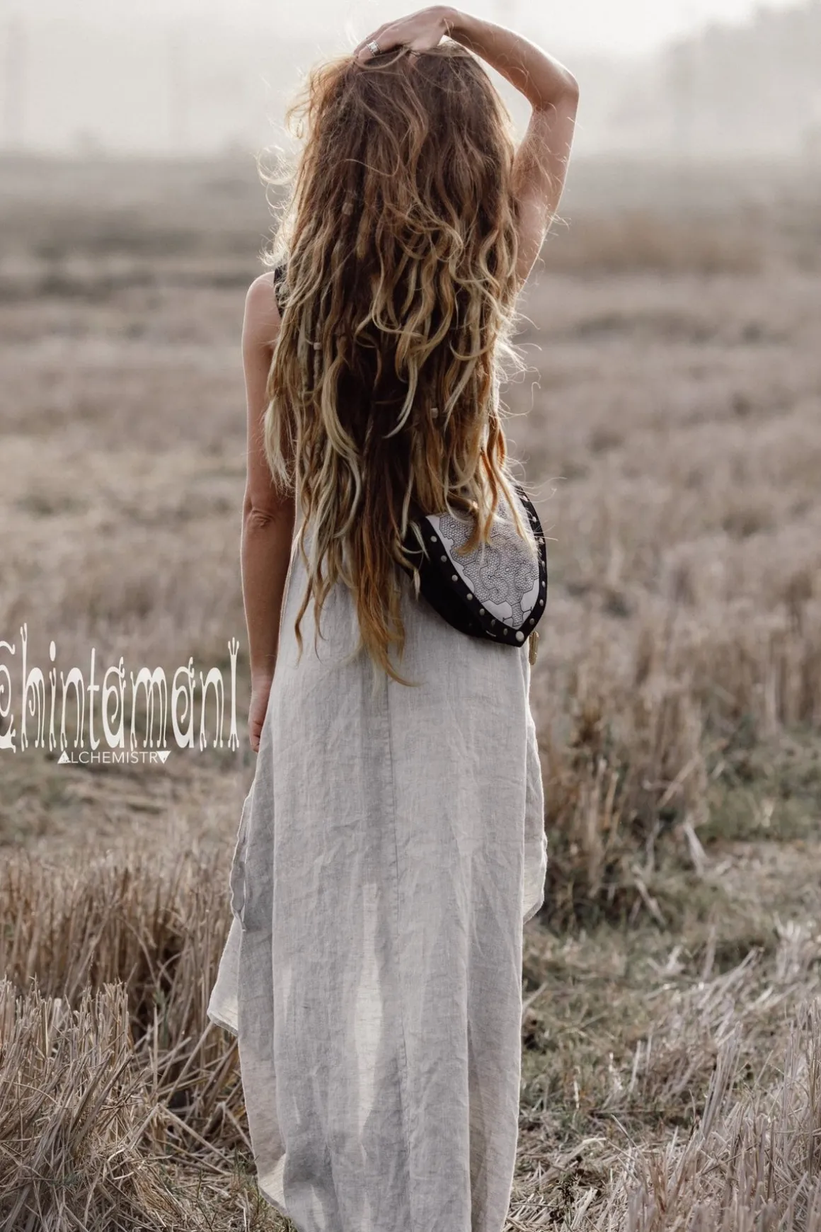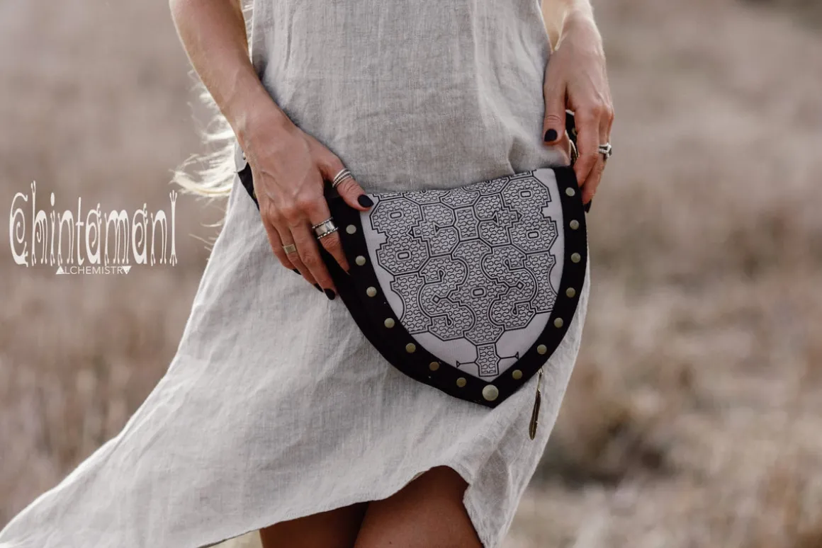 Chintamani Alchemistry Pocket Belt Bag is a very special original accessory, that we created long before the recent fashion rebirth of the pouches. Our Canvas Hip Bag unique “droplet” silhouette compliments skirts or dresses and looks more like a belt, than like a baggy fanny pack. To highlight its special design, the bag is decorated with brass rivets on the edge. The piece is very versatile – it can be worn across the body, with its adjustable snap buttoned belt, becoming a decorative stripe, that compliments and shapes floaty boho kimonos and tunics. The main pocket of the Waist Bag is big enough for the phone and small cosmetic necessities, while there are two extra pockets for valuables. Beautiful brass rings on the belt can be used to lock key carabiner or water bottle. Decorated with solid brass original feather. This thigh bag is available in various colors of our natural soft palette and with Shipibo sacred print. This amazing artifact from Chintamani Alchemistry is a true fashion statement, suitable not only for festivals, but for your normal city life as well.