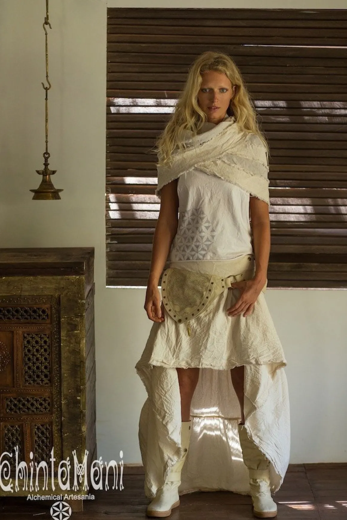 Chintamani Alchemistry Pocket Belt Bag is a very special original accessory, that we created long before the recent fashion rebirth of the pouches. Our Canvas Hip Bag unique “droplet” silhouette compliments skirts or dresses and looks more like a belt, than like a baggy fanny pack. To highlight its special design, the bag is decorated with brass rivets on the edge. The piece is very versatile – it can be worn across the body, with its adjustable snap buttoned belt, becoming a decorative stripe, that compliments and shapes floaty boho kimonos and tunics. The main pocket of the Waist Bag is big enough for the phone and small cosmetic necessities, while there are two extra pockets for valuables. Beautiful brass rings on the belt can be used to lock key carabiner or water bottle. Decorated with solid brass original feather. This thigh bag is available in various colors of our natural soft palette and with Shipibo sacred print. This amazing artifact from Chintamani Alchemistry is a true fashion statement, suitable not only for festivals, but for your normal city life as well.