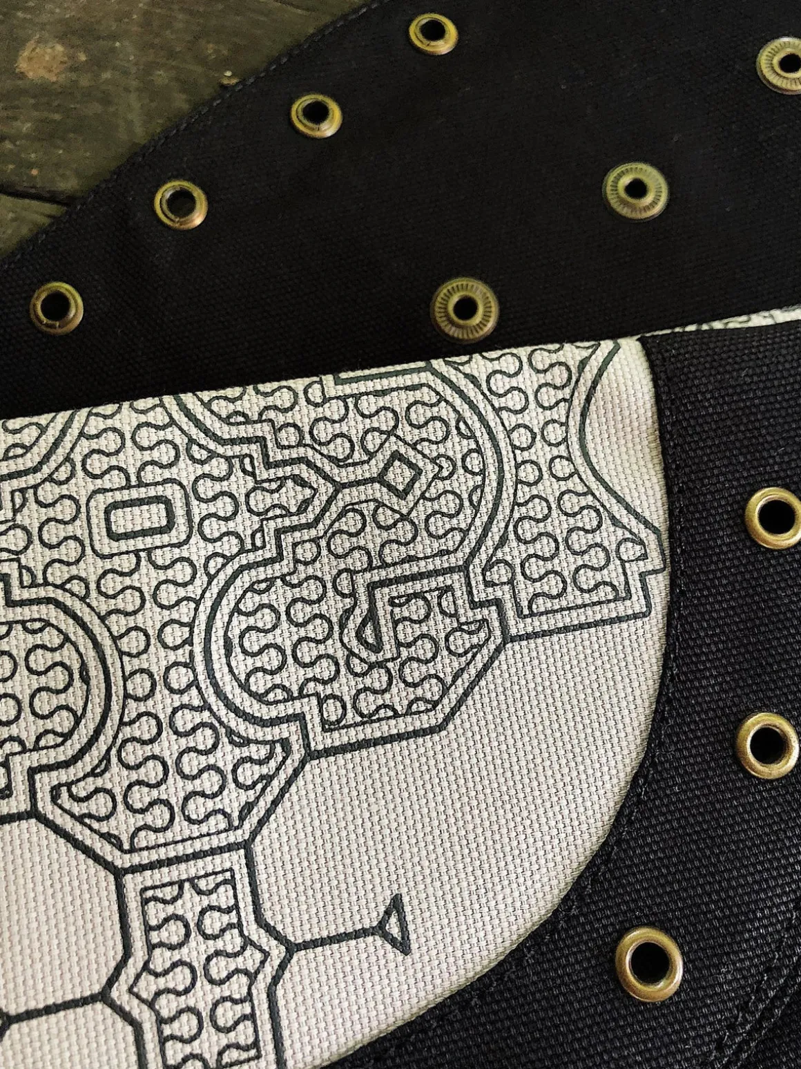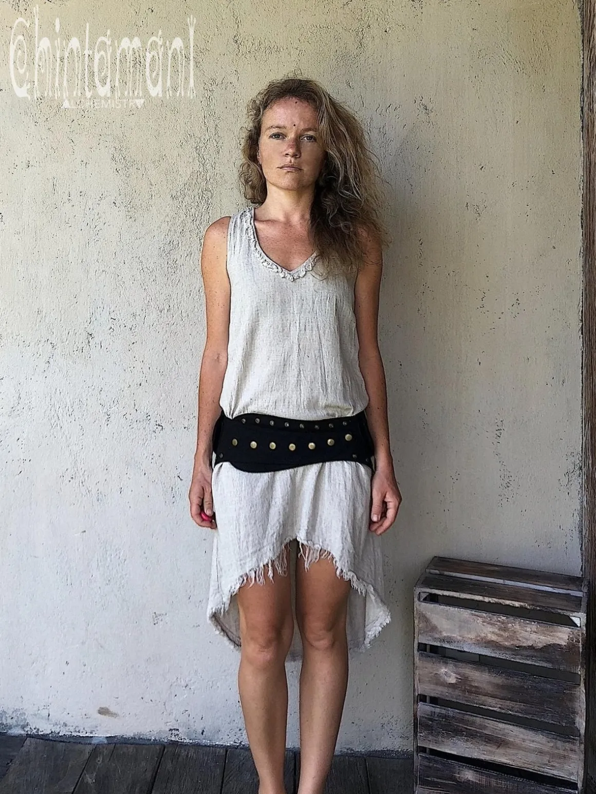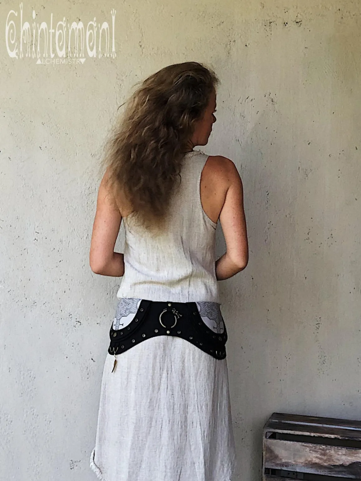 Two Pockets Hip Belt Bag is our classic Festival accessory. Very handy with its two large pockets, and stunningly gorgeous – it shapes any robe, tunic, skirt or dress into bohemian gypsy queen ceremonial gown at once! This Thigh Belt Bag closes with decorative row of snap buttons, so it is very adjustable. You can wear it high or low on the hips, and it is truly free size, fitting up to XL. This piece is both boho and oriental – with the massive brass dragon decoration on the back and screen printed Sacred Geometry patterns on the sides. For the pocket deco we have two options – Shipibo Conibo Indian design and ancient Flower of Life protective grid. There are several buckles, that can be used to clasp your key carabiner or different amulets, and this piece actually comes with one! It is our special solid brass feather pendant, the symbol of Chintamani Alchemistry!