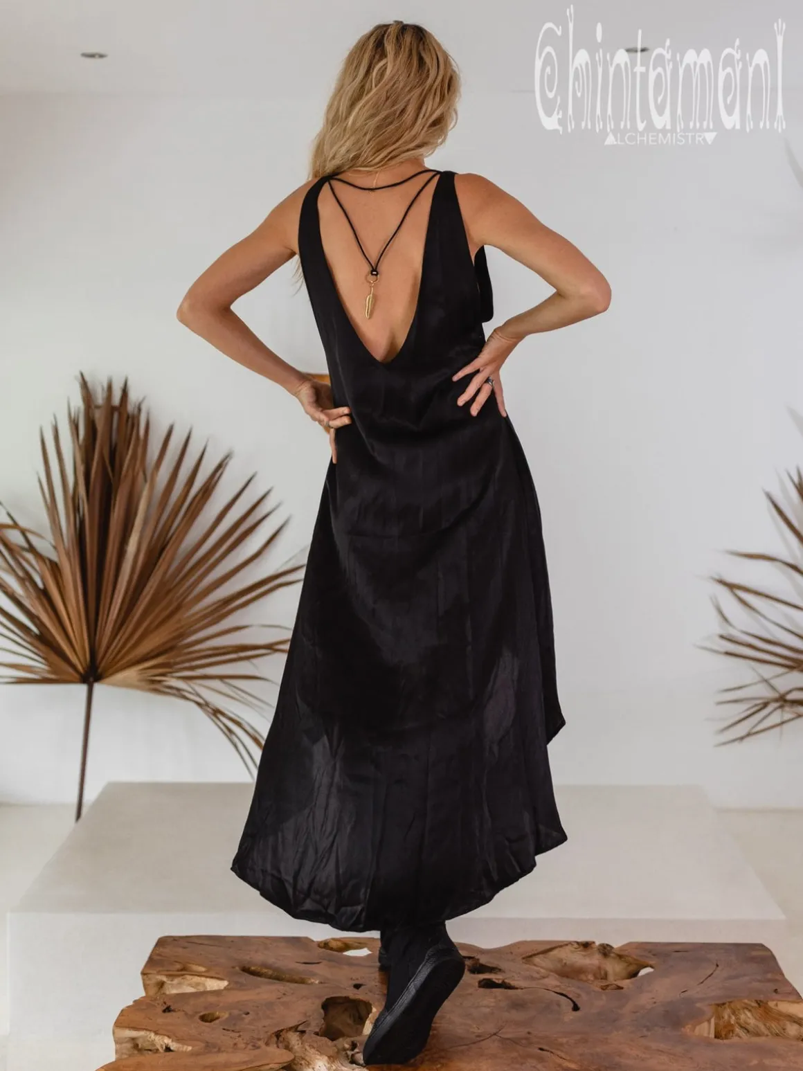 Graceful open back maxi silk dress from our limited collection comes in luxurious, divinely soft natural silk. Its sophisticated silhouette shows off your back in a quite sensual way. Although, don’t worry – specially designed lacing with an amazing brass big feather pendant will keep the dress from sliding from your shoulders unexpectedly. As some of Chintamani Alchemistry asymmetrical long dresses, it has our signature accent – a floaty cascading tail, that looks especially stunning, while you walk. A very convenient detail – the bosom of the dress is double layered, so you can wear it without any bra, for that very special sensation of soft caress and freedom of natural silk! Made from a very high quality exquisite fabrics, the piece was designed for special occasions, but, in fact, this amazing creation feels so good, you will want to wear it every day!