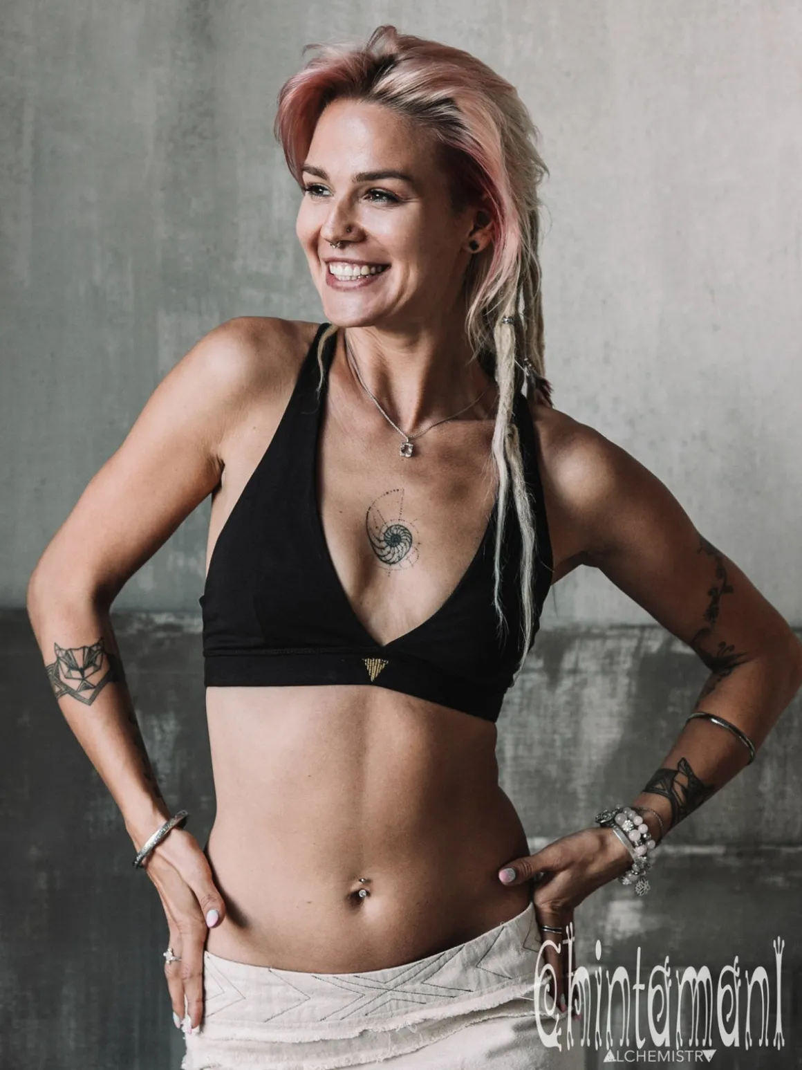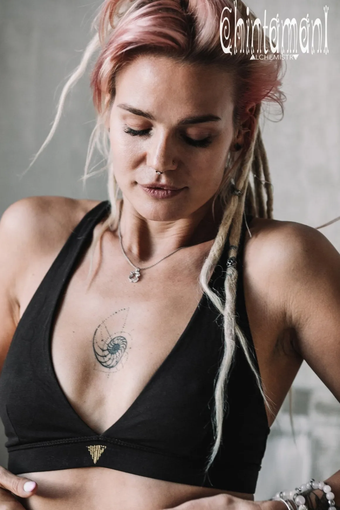 Soft and natural Black Yoga Top for sport, beach holiday or everyday use. This sports bra top made of 90 % cotton and 10 % lycra is that useful little detail of wardrobe, that will let you wear all those semitransparent kimonos, dresses, tunics carelessly and comfortably. It comes in 4 natural and most universal colors – white, black, mint and brown. Natural fabric and lack of any restricting hard frame or tight straps creates divine feeling of freedom. This bikini top is quite sporty to wear as a self sufficient top. Besides, there is a little golden decorative ornament in the front to reassure that option. But you can easily wear this bra as a beach swimsuit or even put some push up padding into specially designed pockets and use it as underwear. In any way this wonderful artifact from Chintamani Alchemistry will look irresistibly sensual and feel just right!