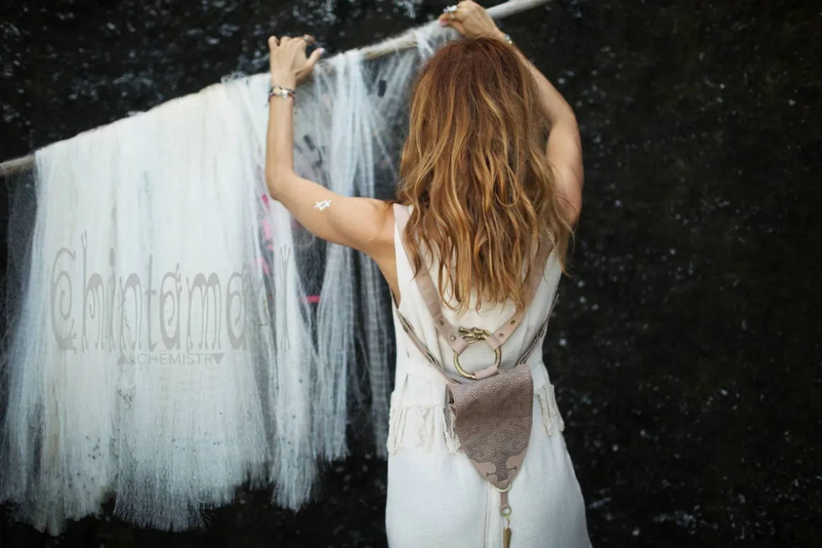 Big Dragon Transformer Unisex Holster Bag / Waist Thigh Bag is a gorgeous artefact of our unique design. It is amazingly flexible – it can be a Lara Croft holster bag or a little fairy backpack – you can transform its long belt with snap buttons in so many creative ways! Furthermore, you can choose your special color, it is available in 4 various shades: black, grey, beige and off-white. The droplet shape of this elaborate creation is reminiscent of medieval shields and coats of arms, big brass ouroboros ring is beautifully oriental and Shipibo screen print was inspired by art of Amazon rain forest tribes. All these many symbols are merged together in a very subtle, true Chintamani Alchemistry way – to create something that looks like an art object, but is quite useful! You can easily put your phone, money and other necessities into one main zipped compartment and two smaller secure pockets of this bag. As all our artifacts, this one is decorated by protective amulet – Chintamani Alchemistry brass feather pendant, handmade in our Bali jewelry workshop!
