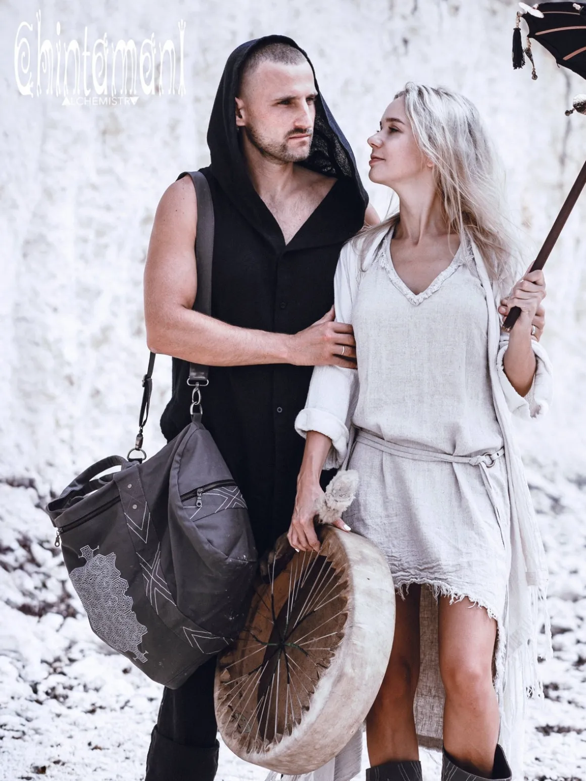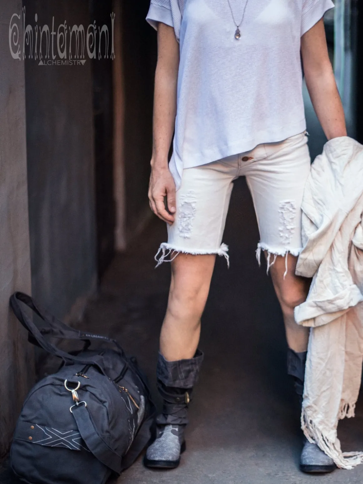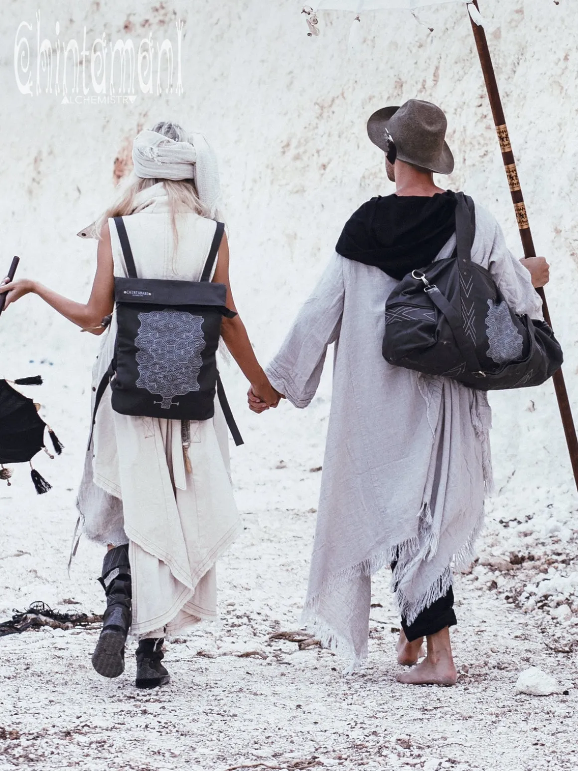 Beautiful Chintamani Alchemistry Large Duffle Bag is made for traveling in style. It is quite spacious, and can contain everything necessary for a short trip, while still being qualified as hand baggage. Also, it is very handy for carrying around your sport and practice equipment – for instance, yoga mat fits inside perfectly! This soft stylish bag is decorated with sacred Shipibo Conibo patterns and geometric tribal stitching. The zipped pocket in front has a little complimentary Feather Pendant – our signature symbol of Lightness and Freedom. Just exactly what this bag was made for!