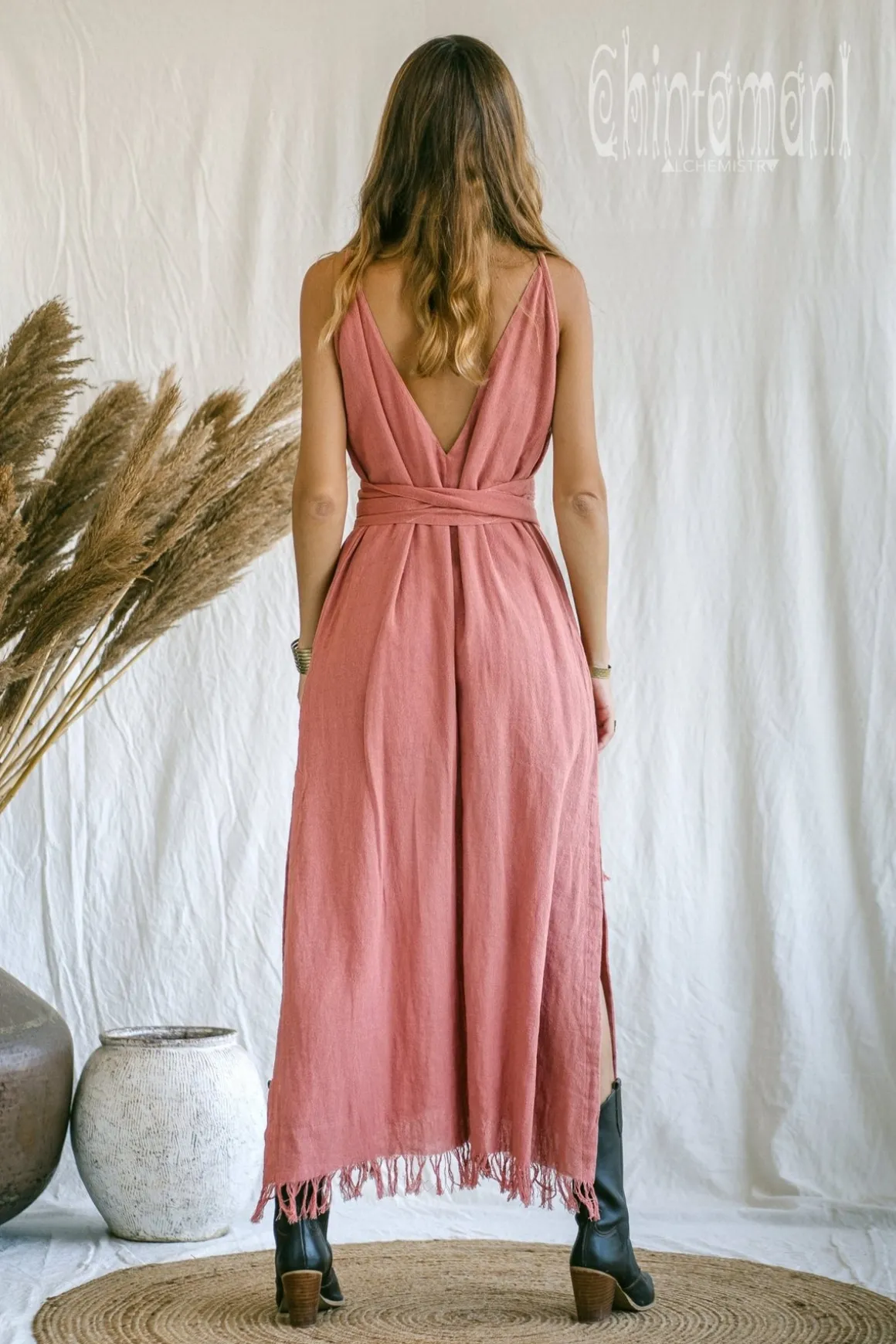 Long and gorgeous Vneck Maxi Dress made of pure cotton – is a perfect base for boho layered look, or a classy outfit by itself. Natural raw cotton is very pleasant to wear. Long strait silhouette with subtle side slits is very simple and noble. Decorative fringe and macramé belt add the designer accent to the piece. It comes in our statement off white gentle color, but also in powerful red, black, earthly brown, soft pink and delicate cappuccino. It can be a evening cocktail or prom dress, a festival outfit or just a favorite light summer seaside garment.