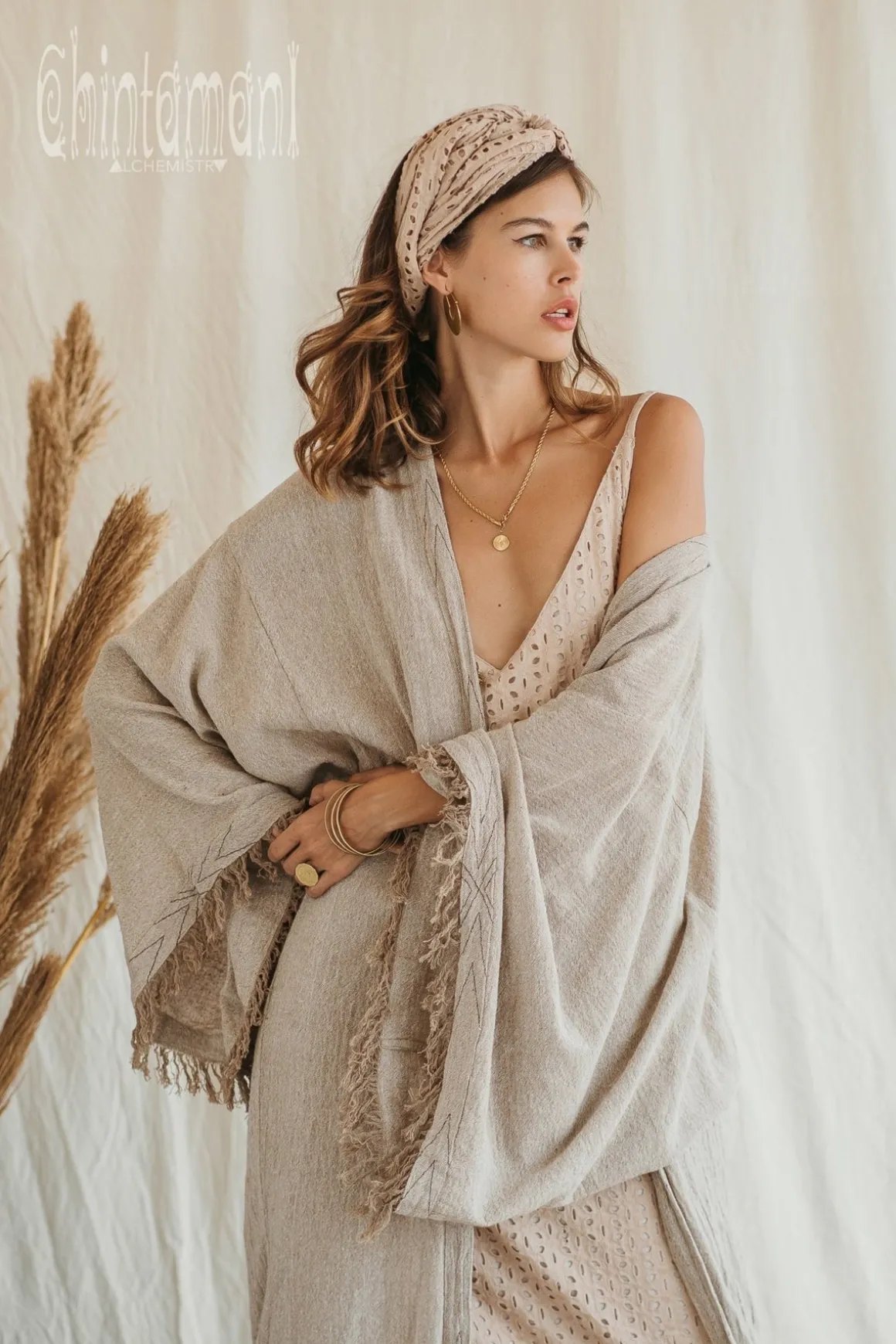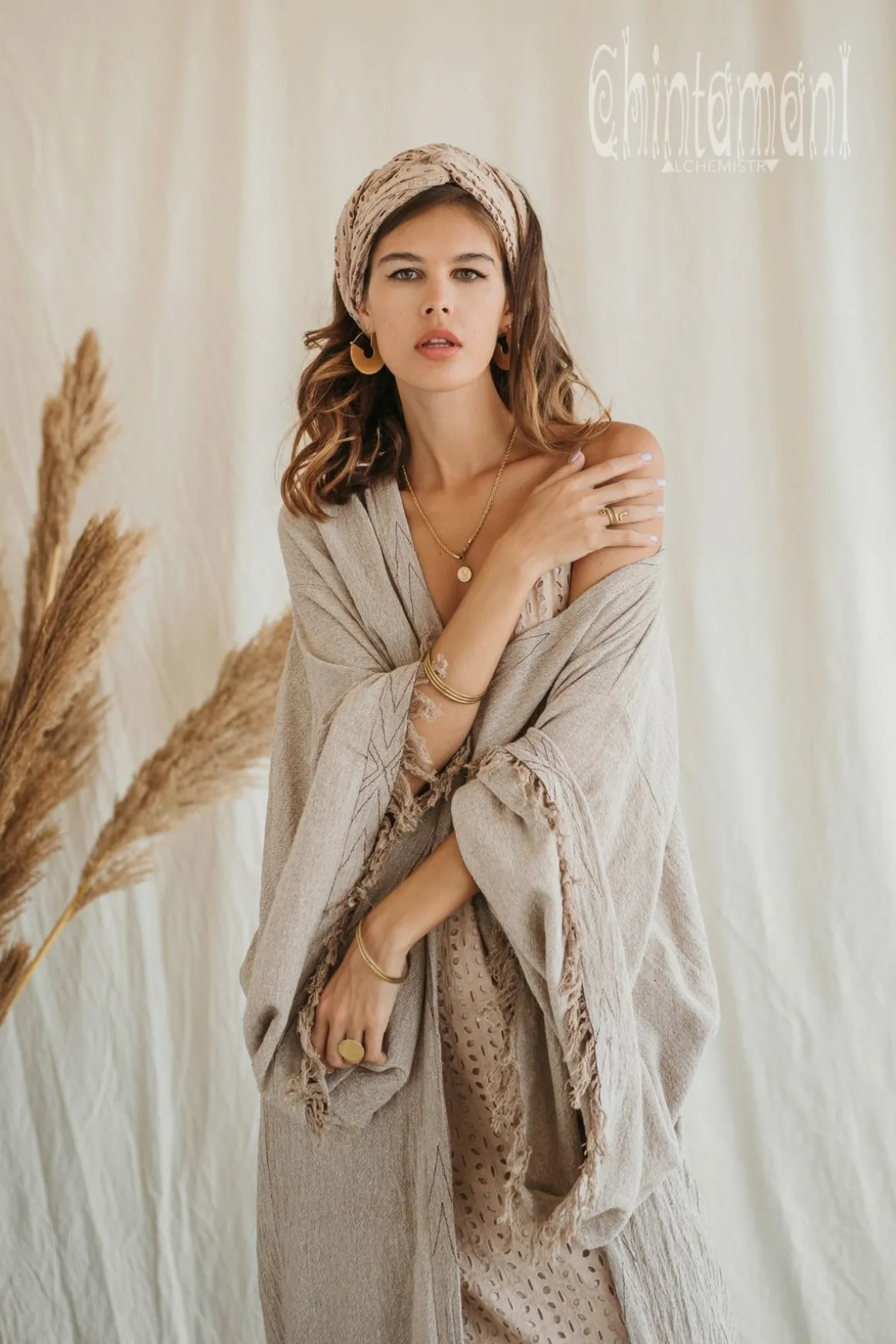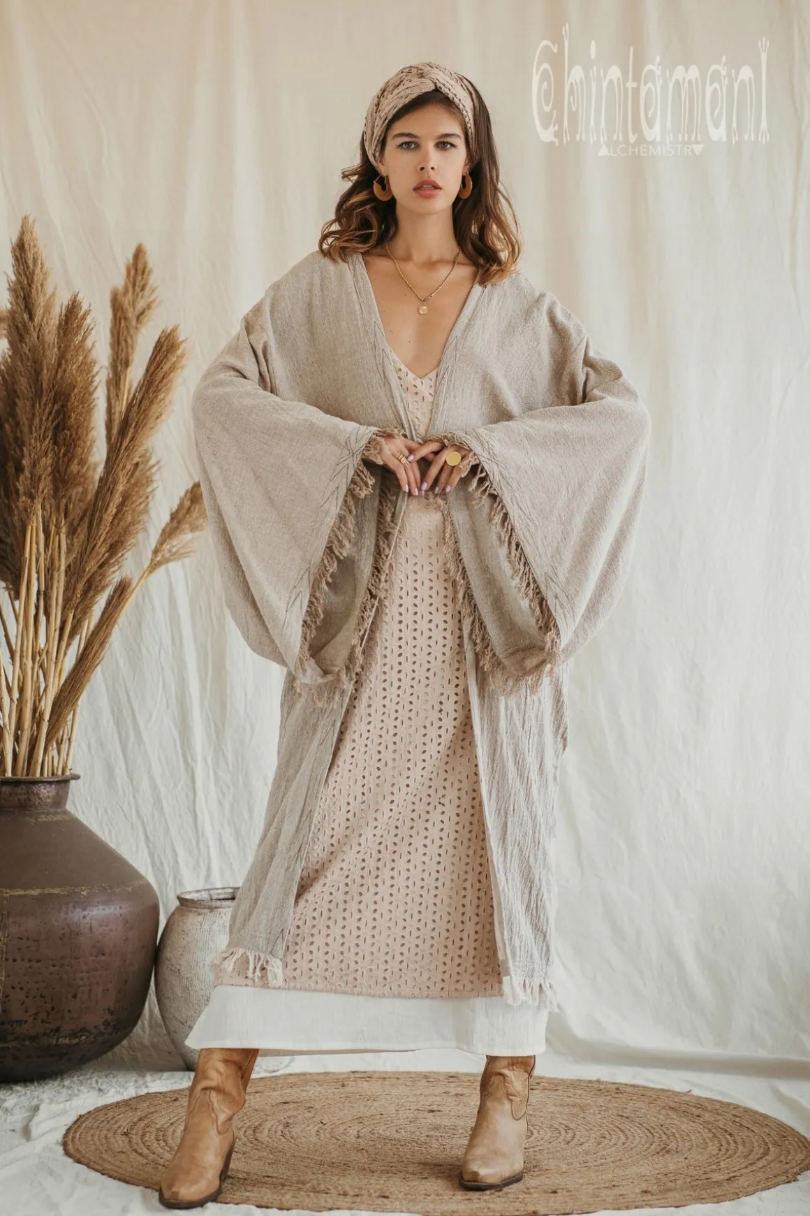 Wide Sleeves Beige Kimono Cardigan is a gem of our raw handwoven cotton collection. This garment is made to flow freely around any type of figure, creating magnificent japanese style draped silhouette. 100% pure cotton fabric is natural and breathable, making wide sleeves kimono jacket a perfect protection from the sun in hot climate. It feels wonderfull on the beach, or as a cozy home gown. But if you put it on top of a dress and accompany with Chintamani Alchemistry belt bag, worn across the back, it will become a classy mantle and complement your boho chic look. Little artistic details, such as stitched decorative stripes and handmade fringes, make this piece ultimately unique.