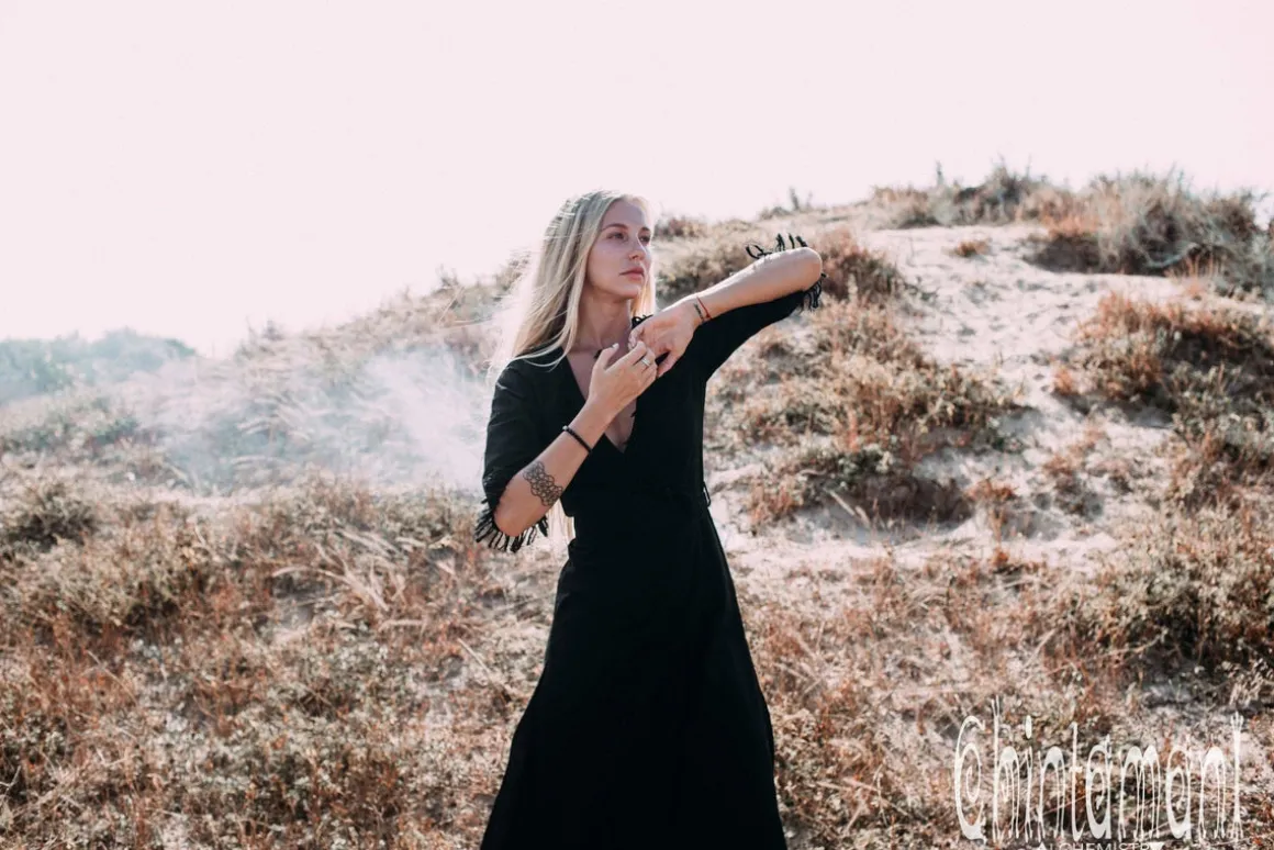 Black Boho Maxi Wrap Dress by Chintamani Alchemistry made of 100% raw cotton with 34 length sleeves, handmade fringe and side slits. Wrap around simple and classy design creates comfortable fit and complements tall and lean figure. Calm, genuine colors of this bohemian organic dress together with raw fabric structure are a perfect ensemble for nature meditation moments. Extremely comfortable handmade item created with attention to detail. Can be also worn as a cardigan.